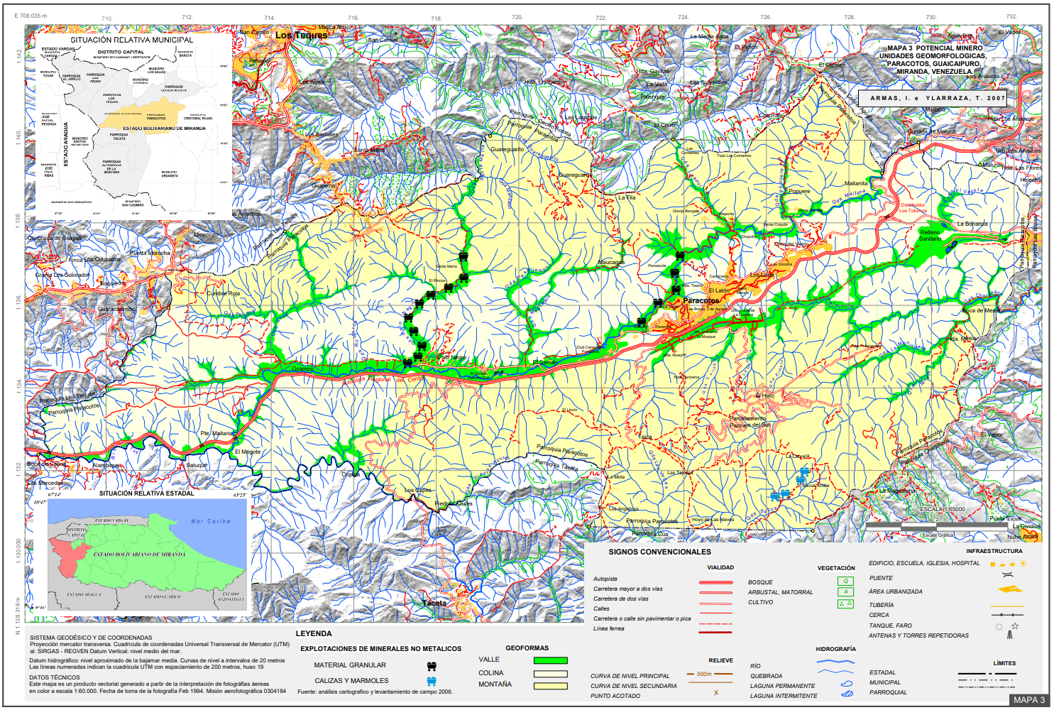 Arena y grava: estos materiales son los constituyentes esenciales en la gran cantidad de hormigón que se usa en construcción de edificios y carreteras en la región. Todos los lechos de ríos y quebradas, particularmente los situados hacia la parte central y occidental de la Parroquia, contienen arena y grava en abundancia. Varias empresas extractivas obtienen los constituyentes de hormigón de los cursos de agua principales, de modo que se cree que las propiedades de este material son adecuadas para el trabajo. En muchos lugares, en las quebradas Maitana y Santa María-Palo Negro, la arena se ha concentrado de una manera tal que es disponible en forma bastante pura. La mayor parte de esta arena es de carácter silíceo, pero localmente, donde las corrientes drenan la Formación Las Mercedes (Noreste), el porcentaje de material calcáreo se hace también bastante grande (Smith, 1952). El costo elevado del desarrollo de un depósito de arena y grava se debe al costo de transporte del producto y a la construcción de caminos hasta los lugares de operación de la región, debido a que la mayor parte de las corrientes de agua del área están a una distancia considerable debajo del nivel general de la región y de las vías principales. En este sentido, la parroquia Paracotos, por poseer importantes vías de acceso cerca de las fuentes, en comparación con otras áreas de la región centro-norte del país, representa una mejor oferta en la disponibilidad de arena y grava a menores costos, tanto ambientales como sociales y económicos, al no tener que construirse nuevos accesos para llegar hasta alguna fuente en lugares más remotos. Para la extracción mineral en la Parroquia solo se requiere tomar en consideración las condiciones ecológicas y ambientales del área para evitar daños irreversibles a los ecosistemas locales y las consecuentes secuelas sociales que suele traer consigo este tipo de eventos (Figuras 52 a 55, Mapa 3).
